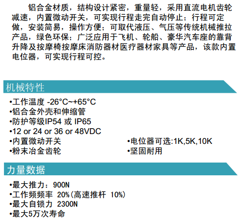 鋁合金材質(zhì),結構設計緊密,重量輕,采用直流電機齒輪減速,內(nèi)置微動開關,可實現(xiàn)行程走完自動停止;行程可定做,安裝簡易,操作方便;可取代液壓、氣壓等傳統(tǒng)機械推拉產(chǎn)品,綠色環(huán)保;廣泛應用于飛機、輪船、豪華汽車座的靠背升降及按摩椅按摩床消防器材醫(yī)療器材家具等產(chǎn)品,該款內(nèi)置電位器,可實現(xiàn)行程可控。