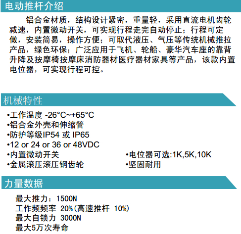 鋁合金材質(zhì),結(jié)構(gòu)設(shè)計(jì)緊密,重量輕,采用直流電機(jī)齒輪減速,內(nèi)置微動開關(guān),可實(shí)現(xiàn)行程走完自動停止;行程可定做,安裝簡易,操作方便;可取代液壓、氣壓等傳統(tǒng)機(jī)械推拉產(chǎn)品,綠色環(huán)保;廣泛應(yīng)用于飛機(jī)、輪船、豪華汽車座的靠背升降及按摩椅按摩床消防器材醫(yī)療器材家具等產(chǎn)品,該款內(nèi)置電位器,可實(shí)現(xiàn)行程可控。