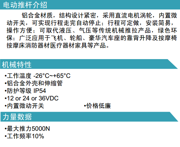 鋁合金材質(zhì),結(jié)構(gòu)設計緊密,采用直流電機渦輪,內(nèi)置微動開關(guān),可實現(xiàn)行程走完自動停止;行程可定做,安裝簡易,操作方便;可取代液壓、氣壓等傳統(tǒng)機械推拉產(chǎn)品,綠色環(huán)保;廣泛應用于飛機、輪船、豪華汽車座的靠背升降及按摩椅按摩床消防器材醫(yī)療器材家具等產(chǎn)品。