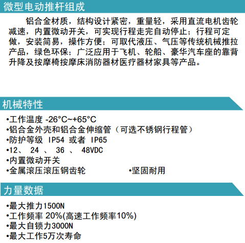 鋁合金材質(zhì),結(jié)構(gòu)設(shè)計(jì)緊密,重量輕,采用直流電機(jī)齒輪減速,內(nèi)置微動(dòng)開關(guān),可實(shí)現(xiàn)行程走完自動(dòng)停止;行程可定做,安裝簡(jiǎn)易,操作方便;可取代液壓、氣壓等傳統(tǒng)機(jī)械推拉產(chǎn)品,綠色環(huán)保;廣泛應(yīng)用于飛機(jī)、輪船、豪華汽車座的靠背升降及按摩椅按摩床消防器材醫(yī)療器材家具等產(chǎn)品。